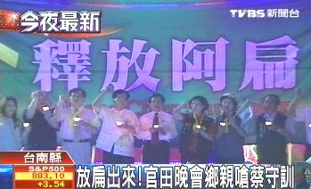 據臺灣TVBS電視臺報道,臺灣本土社團昨天晚上在臺南縣官田鄉(xiāng)西莊惠安宮前廣場舉辦“釋放阿扁”晚會,數百名陳水扁支持者不時高喊口號,最后一起點燃蠟燭,希望陳水扁能在今天獲釋。