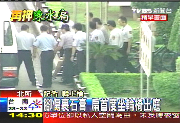 中新網(wǎng)7月15日電 據(jù)臺灣TVBS報道,陳水扁15日下午再度出庭,由于腳受傷,陳水扁必須打石膏坐輪椅出庭,在庭上,陳水扁向審判長抱怨臺北看守所的醫(yī)生醫(yī)術差。