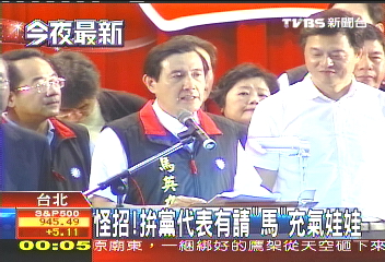 中新網(wǎng)7月21日電 據(jù)臺(tái)灣TVBS報(bào)道,馬英九參選國(guó)民黨主席,20日晚到臺(tái)北縣造勢(shì),有2位民眾激動(dòng)陳情,還有許多競(jìng)爭(zhēng)黨代表的候選人借機(jī)賣(mài)力造勢(shì),有人打造吉祥物,有人居然拿出男性充氣娃娃,臉部畫(huà)成馬英九搶鏡頭。
