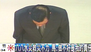 馬英九今日下午率領(lǐng)包括蕭萬長、“行政院副院長”邱正雄等人,向媒體強(qiáng)調(diào)救災(zāi)決心,馬英九也率領(lǐng)全體與會(huì)官員向民眾180度鞠躬致歉,長達(dá)十秒鐘之久。