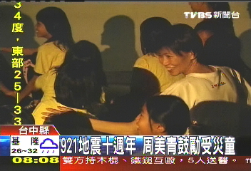 中新網(wǎng)9月8日電 據(jù)臺灣TVBS報道,臺灣921地震十周年,馬英九夫人周美青,7日下午以“周老師”的身份,陪當(dāng)年的災(zāi)童看紀錄片。