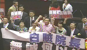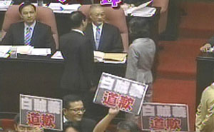 據(jù)臺(tái)灣TVBS報(bào)道,吳敦義還沒(méi)上臺(tái),事前保密到家的民進(jìn)黨“立委”們,突然拿著白布條、標(biāo)語(yǔ)霸占主席臺(tái),大喊“白賊義,道歉”,稱吳敦義香港行的說(shuō)法一變?cè)僮儯姓\(chéng)信問(wèn)題。吳敦義則留在原位,國(guó)民黨人上前安撫,也做護(hù)駕動(dòng)作,避免與民進(jìn)黨“立委”發(fā)生肢體沖突。