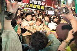 警方表示,藍軍有申請集會游行,綠軍這方?jīng)]有申請,警方必須做好隔離措施避免雙方?jīng)_突;但謝長廷晚上氣憤表示,警方執(zhí)法有問題。他說,藍軍是車隊游行,當然是要事先申請,他們幾十個人徒步掃街拜票,從來沒聽說這樣的掃街拜票還要申請。
