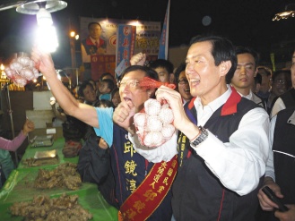 “新埔街上今晚最多人。”陪同掃街的新埔鎮(zhèn)長(zhǎng)賴江海說,秋冬晚上八時(shí)以后街頭冷清,昨晚全站出來。馬英九接著到二重夜市,夜市里民眾爭(zhēng)相與他握手,他看到蒜攤還拿起蒜頭高喊“凍蒜!”