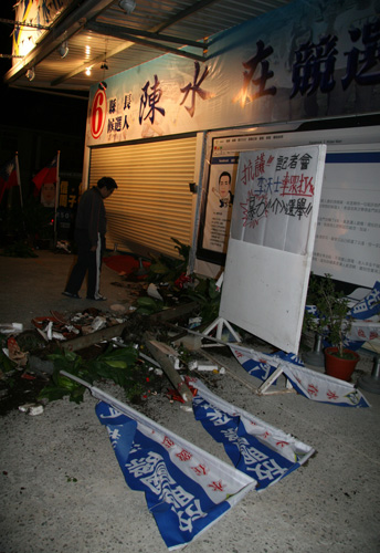 許敬民駕車撞陳水在競選總部時,總部鐵卷門已經(jīng)拉下,內(nèi)部無人,但將鐵卷門撞凹,門外的旗幟撞得東倒西歪,盆栽破碎一地。