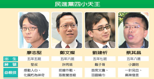 中新網(wǎng)12月14日電 在臺(tái)灣縣市長(zhǎng)選戰(zhàn)結(jié)束后,深受民進(jìn)黨主席蔡英文倚重的“五年級(jí)F4”戰(zhàn)斗團(tuán)隊(duì)成形,民進(jìn)黨桃園縣長(zhǎng)參選人鄭文燦、發(fā)言人蔡其昌、政策會(huì)首席副執(zhí)行長(zhǎng)劉建忻、文宣部副主任廖志堅(jiān),儼然成為民進(jìn)黨的“四小天王”。