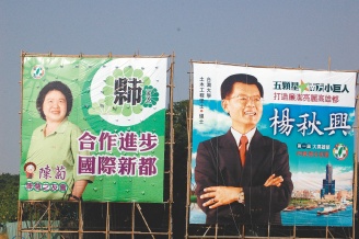 中新網(wǎng)1月18日電 綜合臺(tái)灣《聯(lián)合報(bào)》報(bào)道,大高雄市長(zhǎng)選舉,民進(jìn)黨“秋菊之爭(zhēng)”兩人比鄰豎立廣告牌,“合作進(jìn)步,國(guó)際新都”與“五顆星南方小巨人”互別苗頭。