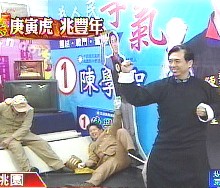 中新網(wǎng)2月21日電 據(jù)臺(tái)灣TVBS報(bào)道,國(guó)民黨“立委”參選人陳學(xué)圣自認(rèn)和香港影星甄子丹有幾分神似,他特別穿馬褂扮演功夫大師葉問,動(dòng)手和助理比劃拳腳,雖然動(dòng)作超慢,卻差點(diǎn)把自己的人形廣告牌“撂倒”。