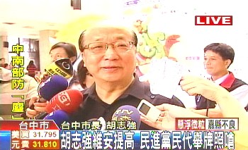 胡志強(qiáng)日前曾遭到一名大學(xué)生亮刀嗆聲,維安問題再度被關(guān)注。臺(tái)中市警局?jǐn)M提高維安規(guī)格,比照“直轄市長”,胡志強(qiáng)表示尊重專業(yè),絕對(duì)配合警方。
