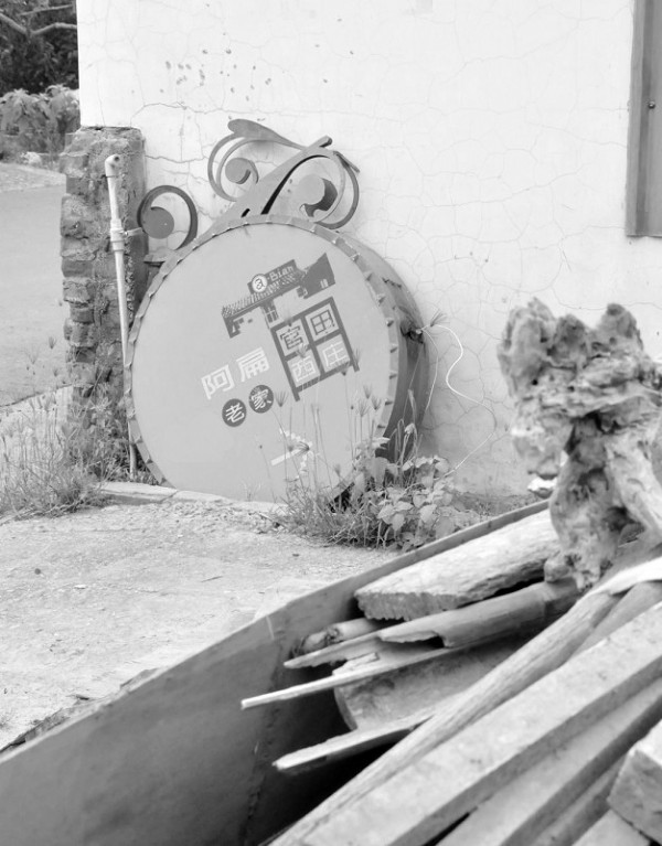 往前再幾分鐘的車程,就到陳水扁的老家西莊村。拐進(jìn)一條無名的小巷,巷口的電線桿上掛有“官田西莊、阿扁老家”的綠色招牌,已是舊跡斑斑。到了另一個巷口,一個圓環(huán)形的“阿扁老家”招牌被扔在廢墟水溝邊上,而不是高高掛起。