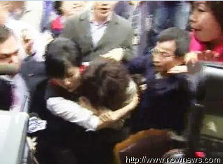 混亂中民進黨籍“立委”邱議瑩被國民黨籍“立委”呂學樟推倒。國民黨籍“立委”徐少萍則是從背后熊抱民進黨籍“立委”林淑芬,兩人因為重心不穩(wěn)跌倒在地上,徐少萍還堅持不放手,十分拼命。