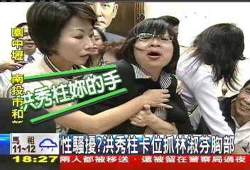 據(jù)臺灣TVBS報(bào)道,國民黨“立委”洪秀柱跟民進(jìn)黨“立委”林淑芬,為了搶發(fā)言臺的位置,洪秀柱從后方抓林淑芬,不偏不倚剛好抓住林淑芬的胸部,后來為了卡位,洪秀柱的頭,又卡在男性“立委”蘇震清的胯下。
