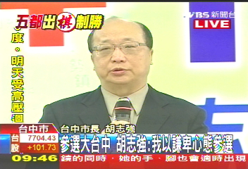 中新網(wǎng)5月13日 據(jù)臺(tái)灣TVBS電視臺(tái)報(bào)道,國民黨中常會(huì)昨天通過“五都”市長提名征召人選,藍(lán)營年底選戰(zhàn)五虎將正式就戰(zhàn)斗位置。爭(zhēng)取大臺(tái)中市長的胡志強(qiáng),今日上午召開記者會(huì),正式對(duì)大臺(tái)中市民表態(tài)參選。他表示將以最謙卑的心情,來參選大臺(tái)中市長。