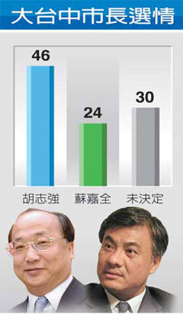 中新網(wǎng)6月4日電 據(jù)臺灣《聯(lián)合報》報道,臺中市接連發(fā)生重大治安和警紀案件,《聯(lián)合報》對大臺中市長最新選情調(diào)查發(fā)現(xiàn),胡志強目前雖以46%支持率領先蘇嘉全22%。