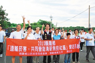 昨天清晨的全民健行活動有3000鄉(xiāng)民參與,山西宮主委張伯祿、副主委汪忠政等率隊出發(fā),一路走到風景優(yōu)美的大潭埤旺萊公園,關廟衛(wèi)生所配合舉辦反煙倡導、衛(wèi)教倡導活動。