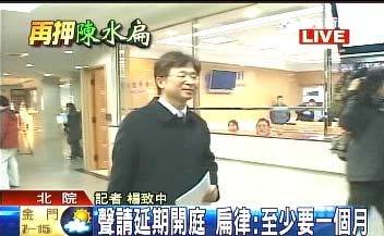 中新網(wǎng)1月14日電 據(jù)臺(tái)灣TVBS報(bào)道,陳水扁律師石宜琳14日下午出現(xiàn)在北院,他在4點(diǎn)遞狀,聲請(qǐng)1月19日至21日的準(zhǔn)備程序庭延期,他以卷宗太多尚未看完,以及律見(jiàn)30分鐘無(wú)法與扁詳細(xì)討論案情為理由,希望延期至少1個(gè)月。