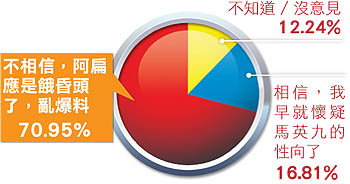 除此之外,臺(tái)灣《蘋(píng)果日?qǐng)?bào)》還做了民意調(diào)查,結(jié)果顯示,70.95%的臺(tái)灣受訪(fǎng)民眾認(rèn)為關(guān)于馬英九同性戀的說(shuō)法是陳水扁餓昏了頭亂爆料,只有16.81的民眾表示相信此事。(韋博)