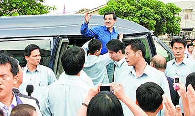 中新網(wǎng)3月23日電 據(jù)臺(tái)灣《蘋果日?qǐng)?bào)》報(bào)道,馬英九22日下午前往嘉義視察途中,座車左后輪突然爆胎,緊跟在后方的廂型車緊急煞車與座車輕微追撞,由于事發(fā)突然,隨行安全人員嚇了一跳,馬英九了解狀況后,立即換車?yán)^續(xù)行程。馬英九安全未受影響,事后也表示自己“處變不驚”。