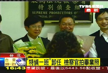 至于檢察官朱朝亮和沈明倫兩人,面對鏡頭似乎就嚴肅的多,乖乖的站在特偵組招牌前,和大家拍照留念,盡管沒有像吳文忠笑得合不攏嘴,看來心情還不錯。