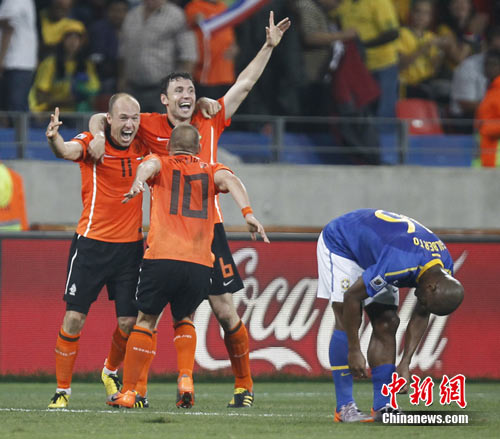 中新網(wǎng)7月2日電 今晚22:00,南非世界杯進行了1/4決賽的首場比賽,由荷蘭隊在伊麗莎白港的曼德拉灣球場迎戰(zhàn)巴西。雖然羅比尼奧在上半場率先破門,但下半場憑借梅洛的烏龍球和斯內德頭槌建功,荷蘭隊2-1逆轉擊敗巴西隊,率先挺進四強。