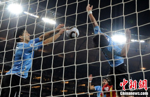 直到加時(shí)賽的最后一分鐘,蘇亞雷斯注定要成為烏拉圭的關(guān)鍵先生。當(dāng)時(shí)加納獲得前場(chǎng)任意球機(jī)會(huì),皮球開出后頭球攻門被擋出,隨后對(duì)方隊(duì)員補(bǔ)射,站在門線上的蘇亞雷斯用一個(gè)排球“攔網(wǎng)”的動(dòng)作將球擋出。