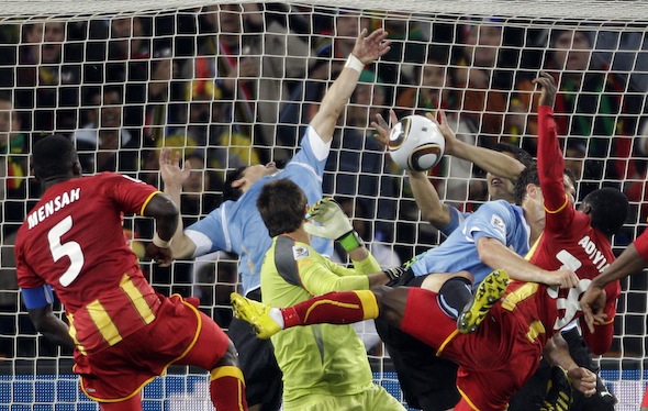 中新網(wǎng)7月3日電 在與加納隊的比賽加時賽補(bǔ)時最后一分鐘用手將加納的射門拍出后,烏拉圭隊前鋒蘇亞雷斯被紅牌罰下,并被判罰點(diǎn)球。烏拉圭隊不負(fù)眾望,在加納隊罰丟點(diǎn)球后,他們在點(diǎn)球大戰(zhàn)中將非洲黑星淘汰出局。賽后,蘇亞雷斯的舉動也引起了各方的熱議。
