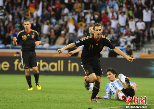 中新網(wǎng)7月3日電 今晚22:00,南非世界杯1/4決賽第三場展開了角逐,阿根廷隊(duì)在開普敦綠點(diǎn)球場迎來了德國隊(duì)的挑戰(zhàn)。穆勒在上半場第3分鐘先拔頭籌,下半場克洛澤梅開二度,弗雷德里希也打入一球,德國隊(duì)4-0狂勝阿根廷,昂首晉級(jí)半決賽。