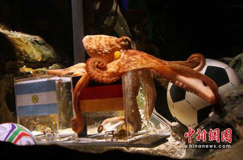 這也是它連續(xù)猜中的第五場比賽。在賽前,德國奧博豪森的海洋館館員把兩個完全一樣的貽貝放入分別印有德、阿旗幟的玻璃缸,章魚“保羅”對德國和阿根廷的對決有些“猶豫不決”,“考慮了長達一小時”但是最終還是取出了印有德國旗幟玻璃缸里的貝類大快朵頤。