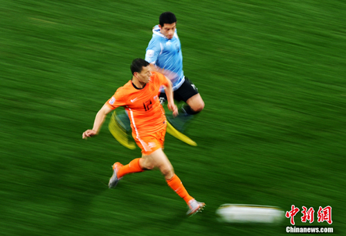 中新網(wǎng)7月7日電 今天凌晨2:30,南非世界杯半決賽首場較量在開普敦綠點球場拉開戰(zhàn)幕,由南美老牌勁旅烏拉圭迎戰(zhàn)荷蘭隊。布隆克霍斯特遠射先拔頭籌,而弗蘭也通過一記遠射將比分扳平。下半場斯內(nèi)德和羅本連續(xù)進球一度令荷蘭隊鎖定勝局,然而補時階段烏拉圭人的進球似乎又燃起了最后的希望,但荷蘭隊頂住了對手的瘋狂進攻,3-2擊敗烏拉圭隊,成功挺進決賽。