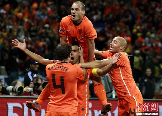 下半場,荷蘭隊對烏拉圭大門形成圍攻之勢,第70分鐘斯內德橫向帶球后射門,皮球打在后衛(wèi)腿上折射,穆斯萊拉鞭長莫及。雖然范佩西處在越位位置,但主裁判依舊認定進球有效,正是憑借這個進球荷蘭隊2比1再度領先!