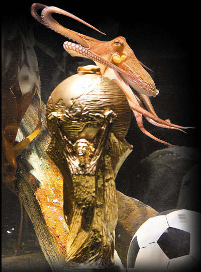 中新網(wǎng)7月13日電 英國(guó)廣播公司報(bào)道,因成功預(yù)測(cè)德國(guó)隊(duì)在南非世界杯賽中的每場(chǎng)比賽結(jié)果以及西班牙隊(duì)奪冠而聞名于世的章魚保羅被授予一個(gè)世界杯獎(jiǎng)杯模型。