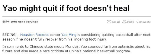中新網(wǎng)7月28日電 據(jù)EPSN報道,姚明近日在北京參加慈善晚宴時,在接受網(wǎng)友提問中親口證實將在今年季前賽復出,但他同時講出驚人之語:一旦出現(xiàn)腳傷反復的最壞情況,不排除下個賽季就退役。