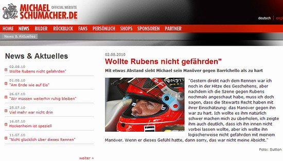 舒馬赫在官網上稱:“再次看過我與魯本斯之間的錄像后,我覺得干事的處罰是正確的。那種強硬的防守確實太過分了。我沒有發(fā)覺我的動作帶給他的危險。如果他這么覺得,那么我要說:對不起,我不是故意的!