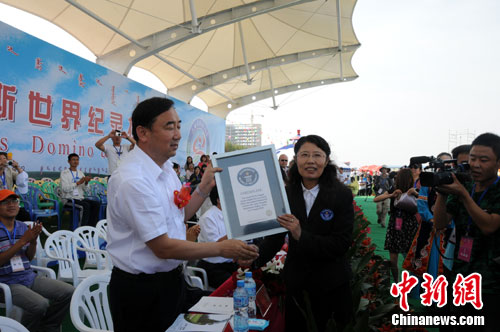 今天的活動(dòng)打破了新加坡在2000年9月30日由9234名學(xué)生在圣陶沙島西樂索海灘創(chuàng)造的人體多米諾吉尼斯世界紀(jì)錄。經(jīng)過最終的檢查和確認(rèn)后,新的紀(jì)錄正式生效,吉尼斯世界紀(jì)錄認(rèn)證官吳曉紅向鄂爾多斯市長(zhǎng)云光中頒發(fā)了吉尼斯世界紀(jì)錄證書。