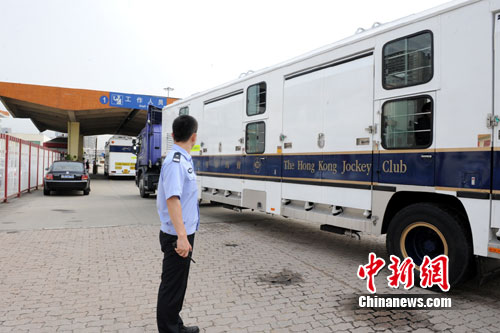 10日清早7時40分,香港賽馬會的兩輛粵港兩地牌貨車(車內(nèi)運(yùn)有18匹賽馬)和6輛隨行保障車由香港經(jīng)皇崗口岸入境,皇崗邊檢站警戒隊按預(yù)案要求,派警車從橋頭將運(yùn)馬車輛一行安全引帶至貨檢入境查驗場地?吭谥付ǖ呐R時候檢區(qū)域,并擔(dān)負(fù)警戒監(jiān)護(hù)工作。在檢驗檢疫部門進(jìn)行消毒的同時,貨車檢查隊、小(客)車檢查隊的民警立即聯(lián)動,高效、快捷、優(yōu)質(zhì)的為入境機(jī)動車司機(jī)、馬童及隨行人員共33人的證件辦理查驗手續(xù)。8時50分,運(yùn)馬車輛及隨行人員離開皇崗口岸前往廣州亞運(yùn)馬術(shù)場。