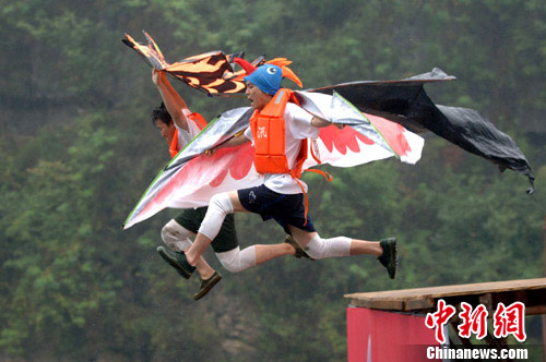 記者在現(xiàn)場看到,來自中國各地的6名鳥人跳水愛好者參加了今天的首跳儀式。水上拓展區(qū)周圍,放著20多副“鳥人”翅膀,有的像老鷹的翅膀,有的像大風(fēng)箏,有的做成汽車模樣,有的像仙女服裝,有的干脆用幾把普通的雨傘扎成,可謂千奇百怪,各具特色。6名鳥人愛好者依次走上5米高的跳臺,用各種姿勢往下跳。有的騰空躍起,再緩緩下落、有的來一個前空翻再落入水中、有的在空中連翻幾個筋斗直入水中、有的作仰睡狀背先落水,鳥人跳水的怪模樣引得眾多觀眾哈哈大笑。