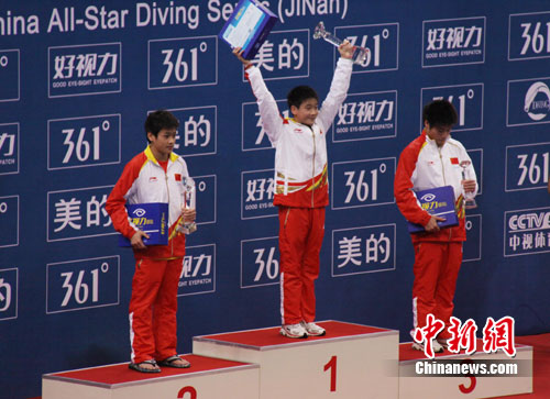 中新社濟(jì)南9月18日電 (張譯文)2010—2011中國跳水明星系列賽第二站的比賽18日晚繼續(xù)在濟(jì)南舉行。在剛剛結(jié)束的男子10米跳臺決賽中,北京選手曹緣憑借完美發(fā)揮獲得105.45高分奪得冠軍,亞軍、季軍分別被來自廣東的張雁全和上海的火亮獲得。