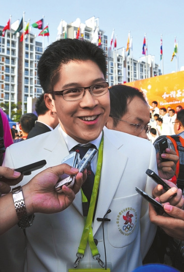 升旗儀式結(jié)束后,霍啟剛便和香港代表團(tuán)的運(yùn)動(dòng)員們簇?fù)碓谝黄鸷嫌傲裟睿鳛榇韴F(tuán)副團(tuán)長(zhǎng)的他,自然沒有忘記自己的身份!斑@一次你會(huì)去看跳水嗎?”當(dāng)華西都市報(bào)記者將這個(gè)問題拋給霍啟剛時(shí),他笑了一笑:“我就知道你要問我這個(gè)問題,在香港我就一直被問這個(gè)問題,到這里來還是被問這個(gè)問題,哈哈!被魡偟钠胀ㄔ挿浅(biāo)準(zhǔn),周圍的香港媒體聽到了霍啟剛這樣回答,也都笑了起來。