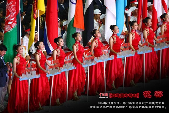 中新社廣州11月12日電(記者 盧巖) 第16屆亞運(yùn)會(huì)今晚在廣州市海心沙拉開(kāi)了帷幕。作為賽會(huì)主角的運(yùn)動(dòng)員們?cè)谌雸?chǎng)式上亮相,在點(diǎn)燃開(kāi)幕式氣氛的同時(shí),也將自己繪成一道道靚麗的風(fēng)景線。