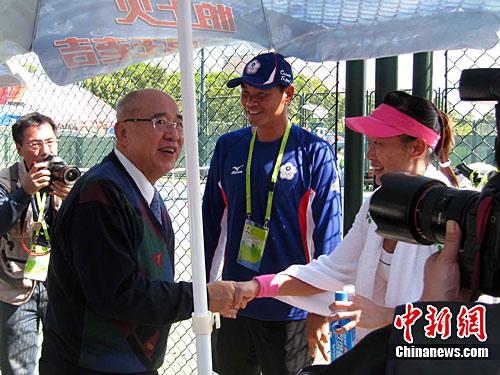 中新網(wǎng)廣州11月13日電 (記者 郭軍)13日上午,廣州亞運(yùn)會網(wǎng)球女子團(tuán)體賽第一輪中華臺北隊(duì)對越南隊(duì)的比賽在奧體網(wǎng)球中心四號場舉行。中國國民黨榮譽(yù)主席吳伯雄來到賽場外為寶島選手加油鼓勁。