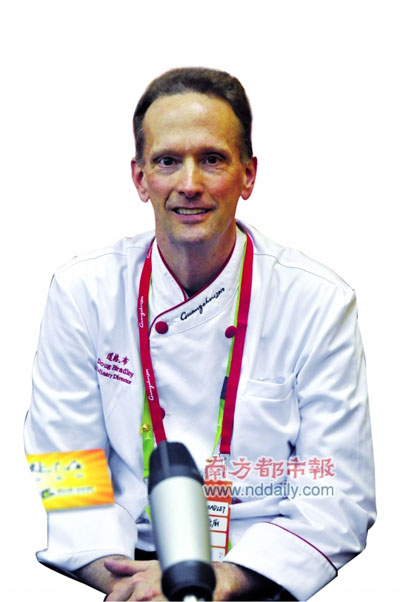 這名身高1 .95米的美國(guó)“總廚”,自2008年北京奧運(yùn)會(huì)后便定居中國(guó),去年12月份還把家安在了廣州,喜歡吃燒鵝,也習(xí)慣在飯后喝上一碗雙皮奶當(dāng)甜品!暗 ,中國(guó)菜能進(jìn)亞運(yùn)菜單絕不是我一個(gè)人說(shuō)了算”。