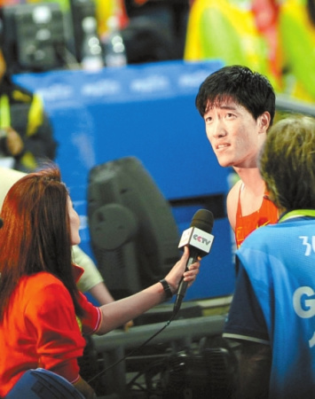 在賽道上僅僅逗留了13秒48,但在賽道一側的混合區(qū)里,近百名記者已經等候了數(shù)十分鐘。終于,翹首企盼的飛人出現(xiàn)在通道的頂頭,狹窄的混合區(qū)里開始騷動,志愿者不得不手扶擋板,免于崩塌。