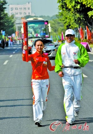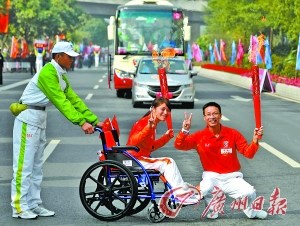 昨日上午,廣州2010年亞洲殘疾人運(yùn)動會廣州火炬?zhèn)鬟f活動在花城廣場拉開帷幕,8.8公里的路途上,共有98名火炬手參與傳遞活動,包括21名殘疾人士。他們中既有杰出的殘疾運(yùn)動員,也有各行各業(yè)的優(yōu)秀殘疾人代表,還有默默耕耘的志愿者和廣州亞運(yùn)會中奪冠的體育健兒,做出積極貢獻(xiàn)的各方面人士。