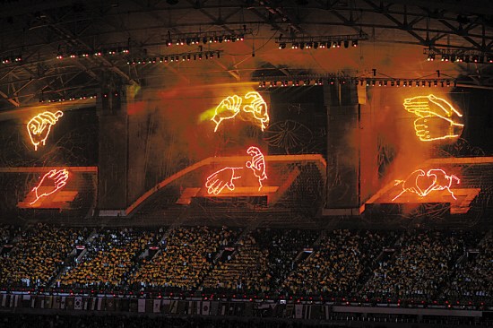 據(jù)了解,開幕式當(dāng)晚,當(dāng)場內(nèi)手語主持人用手語打出“媽媽我愛你”、“朋友我愛你”、“世界我愛你”時(shí),網(wǎng)幕焰火將在夜空中打出“生命”、“陽光”、“關(guān)愛”三組巨型手語圖案。作為首個(gè)手語煙花表演,這個(gè)獨(dú)特的創(chuàng)意來自哪里?黃剛告訴記者:“‘生命陽光,與愛同在’的理念來自胡錦濤總書記提出的‘讓關(guān)愛的陽光照亮每一位殘疾人的心靈’指示精神。說起手語,大家都會想起殘疾人,但是一般人對手語并不太了解,我希望這個(gè)煙花能夠激發(fā)人們對手語的好奇心,去了解手語,并關(guān)注殘疾人,進(jìn)而學(xué)會關(guān)愛殘疾人。”