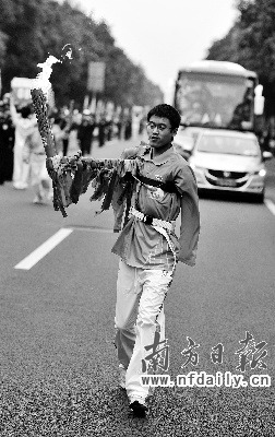 雖然只有短短的95米,但王虎跑得很認(rèn)真,很賣(mài)力?粗@位“特別的”火炬手,站在場(chǎng)外的許多市民早已忍不住流下了眼淚。