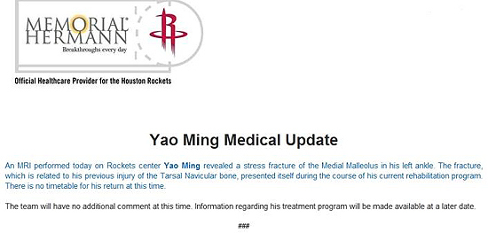 中新網(wǎng)12月17日電 北京時間今日,火箭官方向媒體發(fā)放的新聞稿中表示:中鋒姚明日前接受了核磁共振檢查,但結(jié)果顯示其左腳踝再次出現(xiàn)應(yīng)力性骨折,回歸賽場仍舊遙遙無期。隨后火箭媒體《休斯頓紀(jì)事報(bào)》專家更撰文質(zhì)疑,稱昔日的聯(lián)盟最佳中鋒或許就將因此告別職業(yè)生涯。