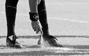 每當場上出現(xiàn)犯規(guī)需要處罰任意球的時候,主裁判就可按照國際足聯(lián)《足球規(guī)則章程》的規(guī)定,迅速跑到犯規(guī)地點,在草坪上噴出白色罰球點,然后再到離罰球點9.15米的位置劃出一條白色人墻線,讓雙方隊員和觀眾一目了然。這不但方便了觀眾觀賽,還讓自己的執(zhí)法更加權(quán)威,也讓雙方隊員都能心服口服。當然,這種方法也讓人心存疑慮,那就是主裁判能否保證通過步測+目測后劃出的線在9.15米左右。
