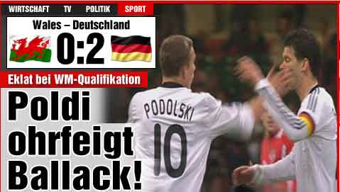 中新網(wǎng)4月2日電 在今天凌晨進(jìn)行的一場世界杯歐洲區(qū)預(yù)選賽中,德國隊(duì)客場2-0輕取威爾士。不過在比賽中,隊(duì)長巴拉克和前鋒波多爾斯基發(fā)生沖突,被隊(duì)友在體育場眾目睽睽之下扇了一記耳光。