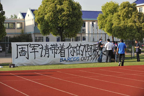 據(jù)現(xiàn)場目擊記者透露,該橫幅上的周字是經(jīng)過球迷改造的,周字中間的口部當(dāng)中出現(xiàn)了兩個(gè)代表美元的符號。據(jù)記者了解,之所以球迷將周軍的周字中間部分做成美元標(biāo)識,是因?yàn)橛蟹婚g傳聞申花的五千萬水貨外援讓其腰包鼓鼓。而橫幅還出現(xiàn)了巴爾克斯的名字,巴爾克斯在申花客場對新加波一戰(zhàn)中雖然攻進(jìn)一球,但是錯(cuò)失多次必進(jìn)球機(jī)會(huì),被認(rèn)為是申花亞冠出局的最大罪人之一,而他恰好是周軍找來的外援。