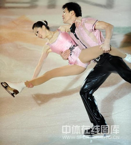 2009年2月25日,為答謝觀眾,獲得第24屆世界大學(xué)生冬季運(yùn)動(dòng)會(huì)花樣滑比賽前三名的選手,在哈爾濱國(guó)際會(huì)展中心體育館進(jìn)行表演。圖為獲得雙人滑冠軍的中國(guó)選手張丹/張昊激情演出。(中體在線圖片 白宇 攝)